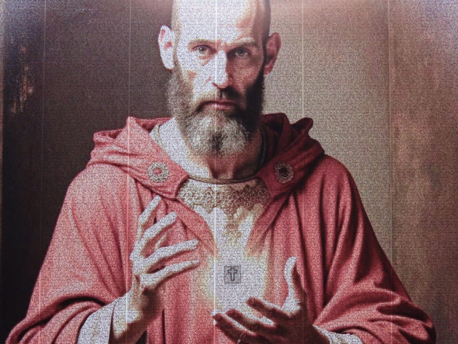 Seus olhos são penetrantes, suas mãos estão abertas como se segurassem o segredo da fé – e nelas não há apenas um símbolo, mas o próprio Evangelho.