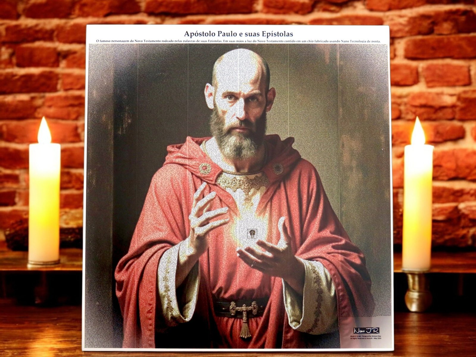 Integração completa das cartas de Paulo e do Novo Testamento, inscritas em texto microscópico sobre um chip de vidro nano – cuidadosamente inserido no centro de suas mãos, como símbolo da Palavra entregue.